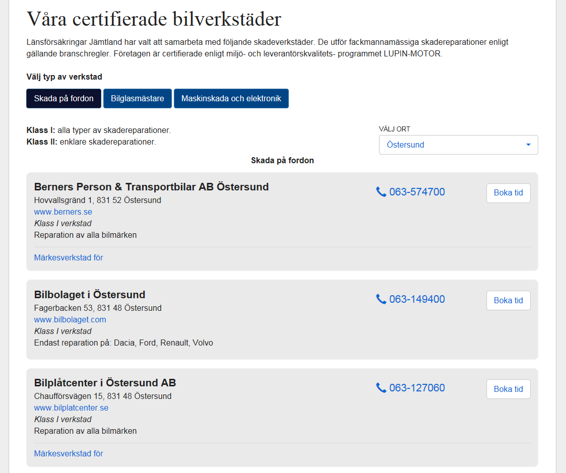 Klicka på knappen Boka tid för den verkstad du vill välja. Om verkstaden inte har onlinebokning visas alltid ett telefonnummer för bokning.