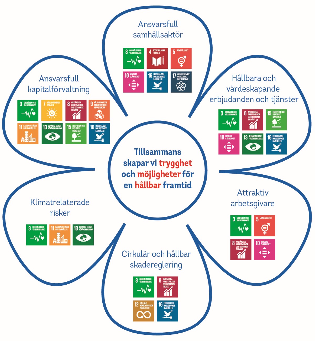 Blomman visar våra viktigaste hållbarhetsfrågor och är fokus i vårt arbete med hållbarhet. De sex hållbarhetsfrågorna är kopplade till FN:s globala hållbarhetsmål och påverkar oss både inom och utanför organisationen och har både ett internt och externt perspektiv.